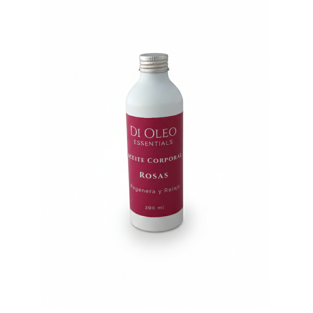 Aceite corporal de rosas. Natural y nutritivo con AOVE, zanahoria y rosa mosqueta. Mejora la elasticidad, regenera la piel y aporta armonía. Ideal para piel madura, cicatrices, manchas y estrías. Aroma sensual y floral. 100% vegetal. En una botella de aluminio con tapa rosca. Dosificador no incluido. 200ml
