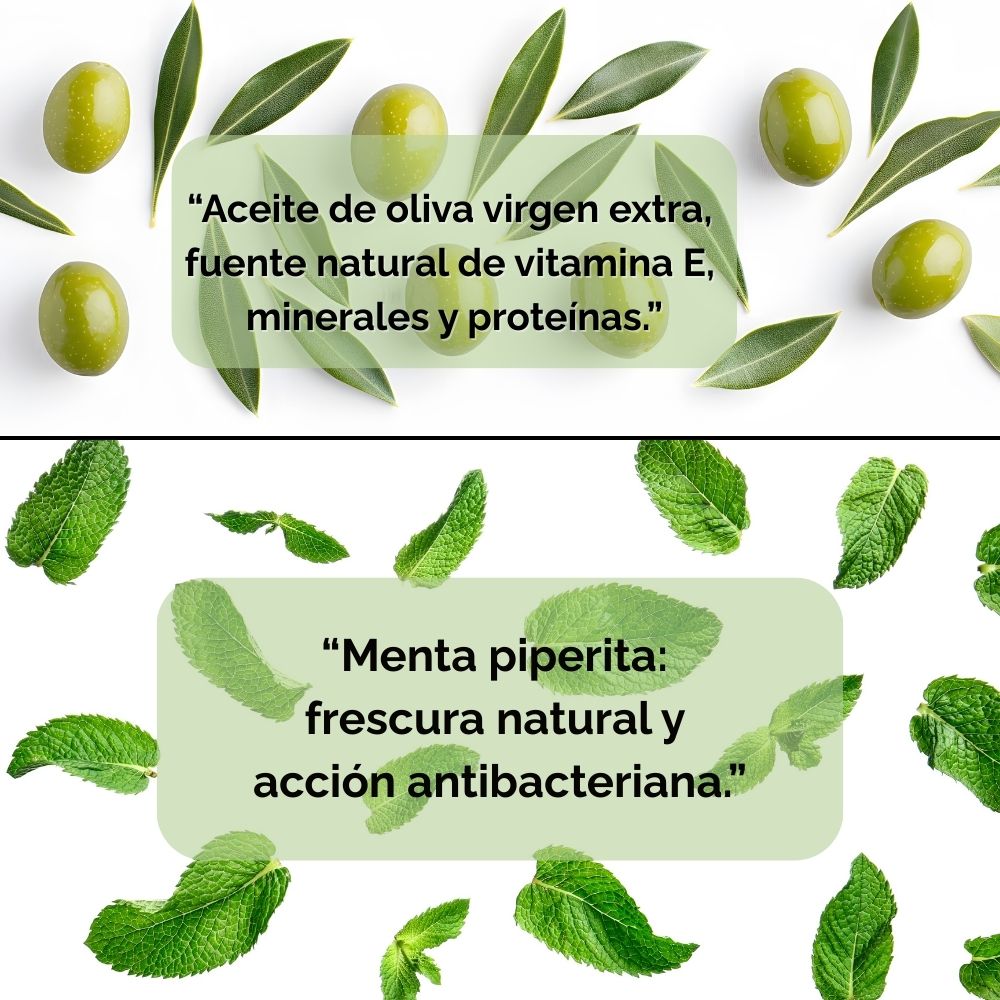 Ingredientes: carbonato cálcico, aceite de oliva virgen extra, xilitol, extracto de caléndula, raíz de lirio, jabón de coco, bicarbonato de sodio, menthol, aceite esencial de menta piperita.